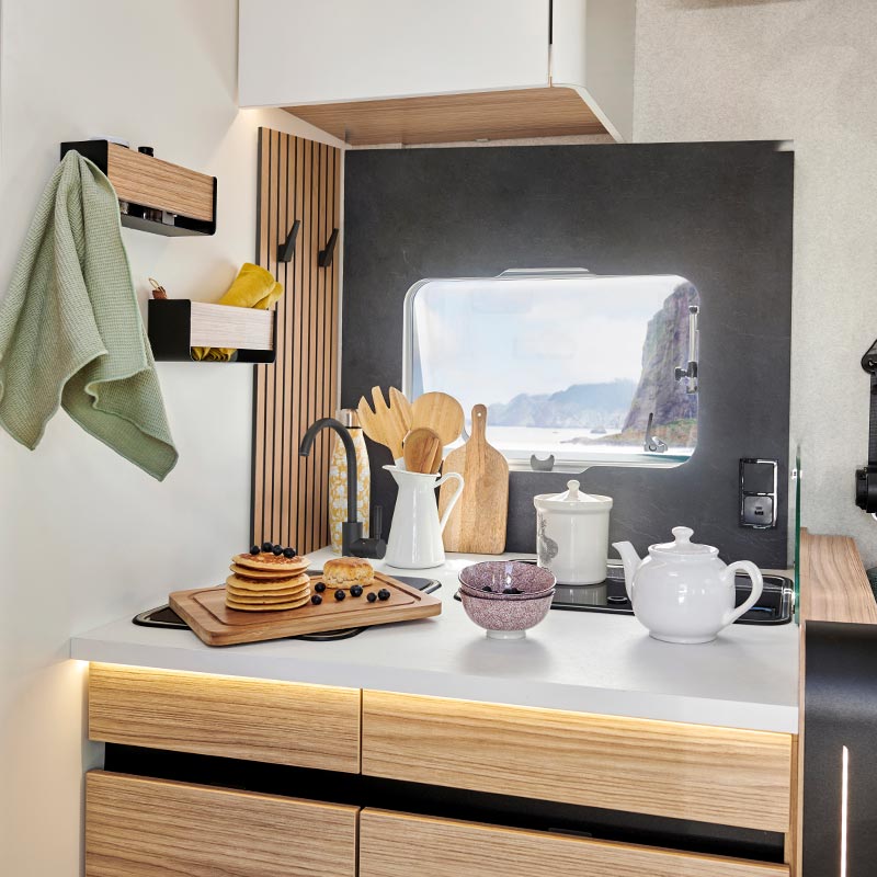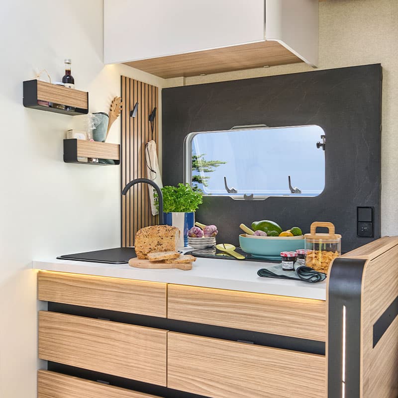 - una toma de gas directamente accesible desde el exterior: disfrute cocinando al aire libre con total seguridad. Prepare deliciosas recetas en el hornillo, en la plancha o en la barbacoa de gas, utilizando directamente la reserva de la autocaravana, sin bombonas adicionales ni complicadas instalaciones.